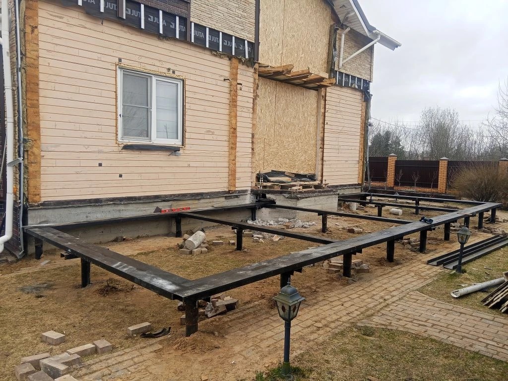 —Фундамент для будущей веранды-оранжереи из 15 винтовых свай и двух швеллеров под стены из бревна
